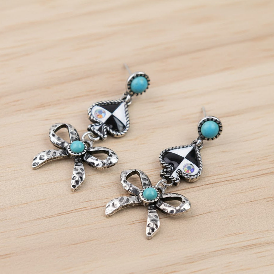 Western spade and bow stud earrings featuring a rustic burnished silver finish with vibrant turquoise accents. These unique earrings combine classic Western style with a bold pop of color to elevate any outfit.
